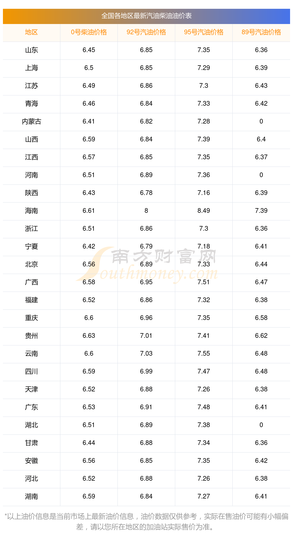 以上數(shù)據(jù)僅供參考,請(qǐng)以您所在地區(qū)的加油站實(shí)際售價(jià)為準(zhǔn)。南方財(cái)富網(wǎng)發(fā)布此信息的目的在于傳播更多信息,對(duì)使用該油價(jià)信息所導(dǎo)致的結(jié)果概不承擔(dān)責(zé)任。