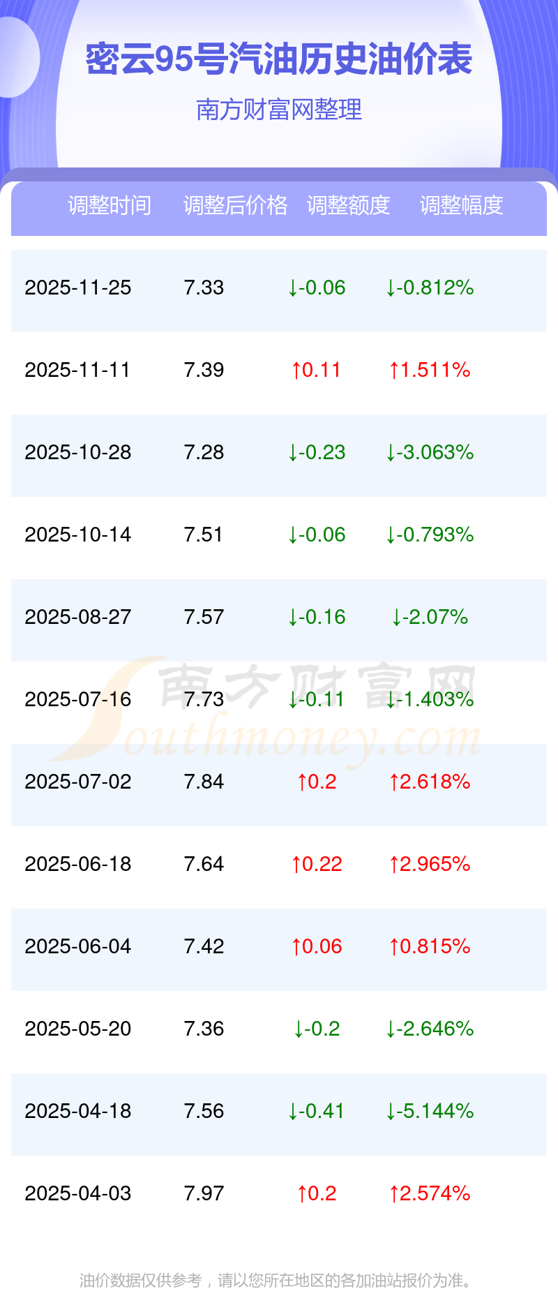 12月4日密云95號汽油的價格為7.33元/升,為11月25日油價調(diào)整后的價格,相對上次調(diào)整降了0.06元,降0.812%。下一輪油價調(diào)整時間12月8日24時,距離現(xiàn)在還有4.46天。