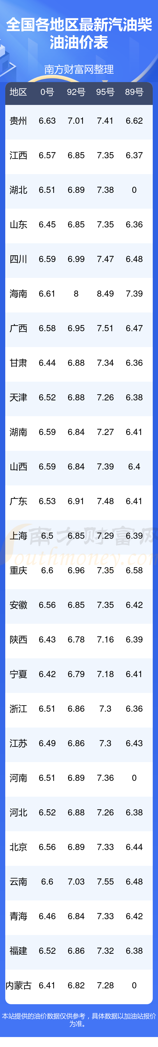 以上油價(jià)信息是當(dāng)前市場(chǎng)上最新油價(jià)信息,油價(jià)數(shù)據(jù)僅供參考,實(shí)際在售油價(jià)可能有小幅偏差,請(qǐng)以您所在地區(qū)的加油站實(shí)際售價(jià)為準(zhǔn)。
