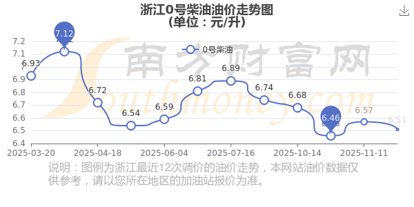 12月4日,浙江0號柴油的價格是6.51元每升,本次的調整時間為11月25日,對比上次的調整減了0.06元,減0.913%,12月8日24時為下一輪油價調整時間,還有4.45天。