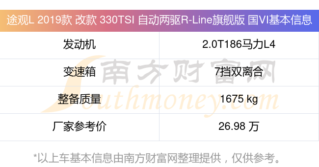 在動(dòng)力方面,途觀L 2019款 改款 330TSI 自動(dòng)兩驅(qū)R-Line旗艦版 國(guó)VI搭載的是一臺(tái)2.0T186馬力L4渦輪增壓發(fā)動(dòng)機(jī),匹配7擋雙離合自動(dòng)檔變速箱,燃料形式為汽油,常規(guī)整備質(zhì)量1675kg,廠家參考價(jià)26.98萬(wàn)元。