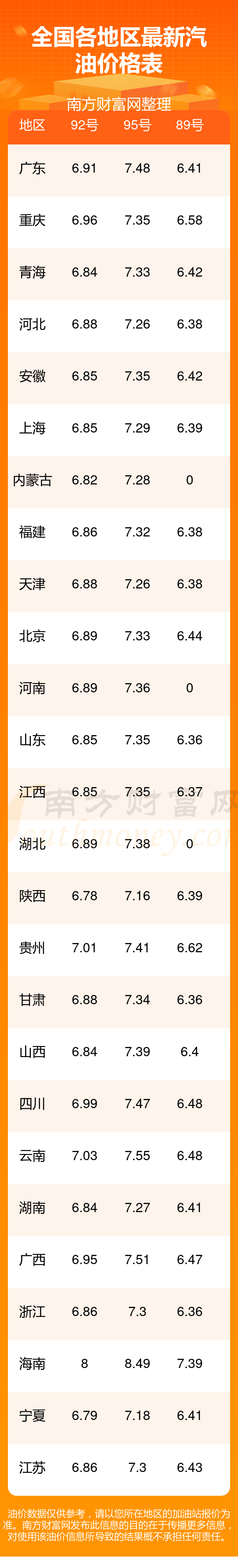 油價數(shù)據(jù)僅供參考,請以您所在地區(qū)的加油站報價為準。南方財富網(wǎng)發(fā)布此信息的目的在于傳播更多信息,對使用該油價信息所導致的結(jié)果概不承擔任何責任。