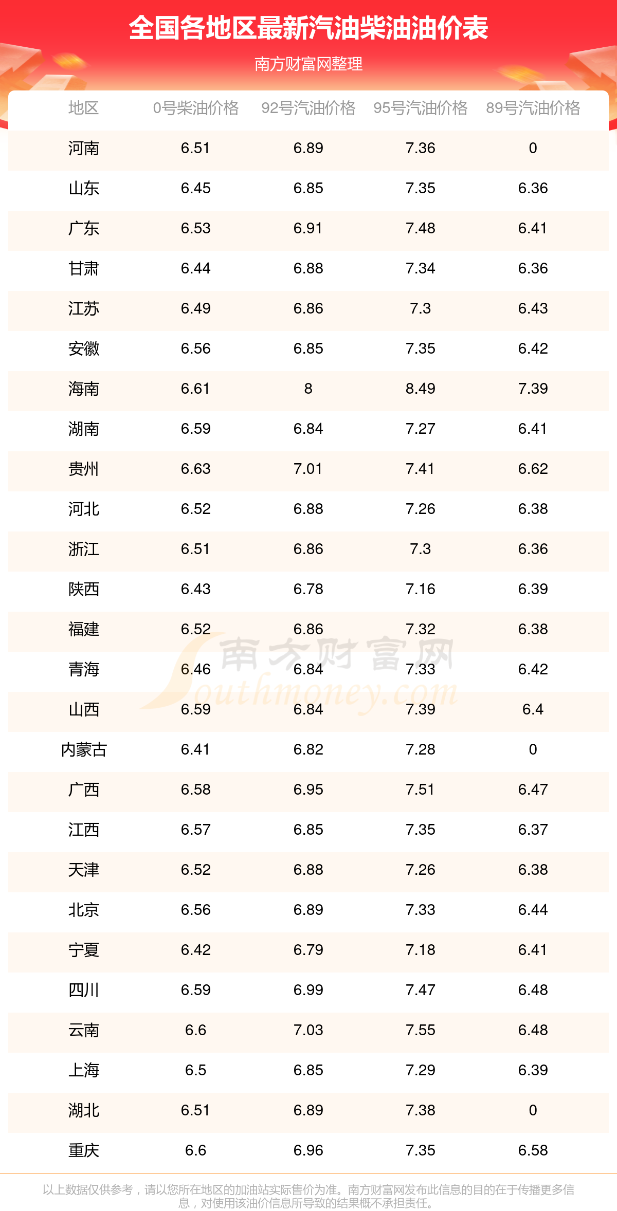 以上數(shù)據(jù)僅供參考,請以您所在地區(qū)的加油站實際售價為準(zhǔn)。南方財富網(wǎng)發(fā)布此信息的目的在于傳播更多信息,對使用該油價信息所導(dǎo)致的結(jié)果概不承擔(dān)責(zé)任。