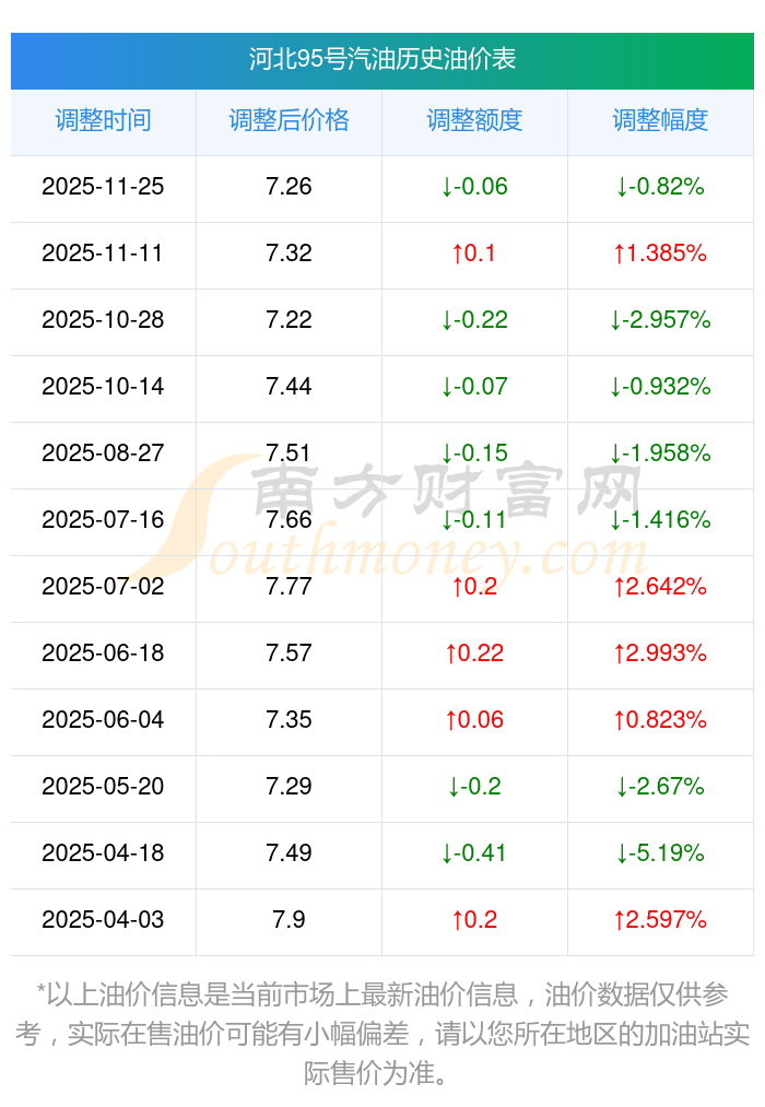 12月4日,河北95號汽油的價格是7.26元每升,本次的調(diào)整時間為11月25日,對比上次的調(diào)整減了0.06元,減0.82%,下次調(diào)整時間為12月8日24時,還有4.42天。