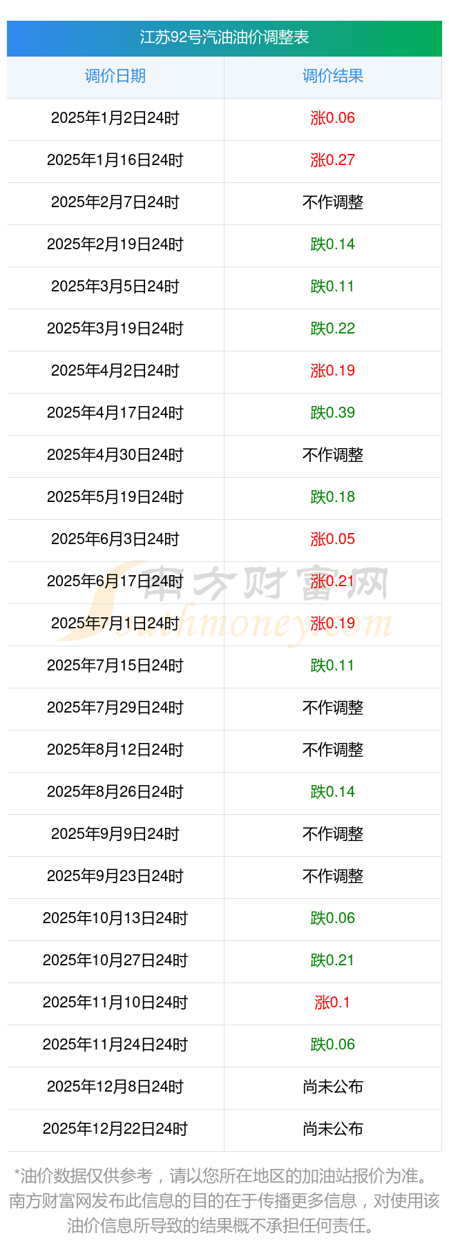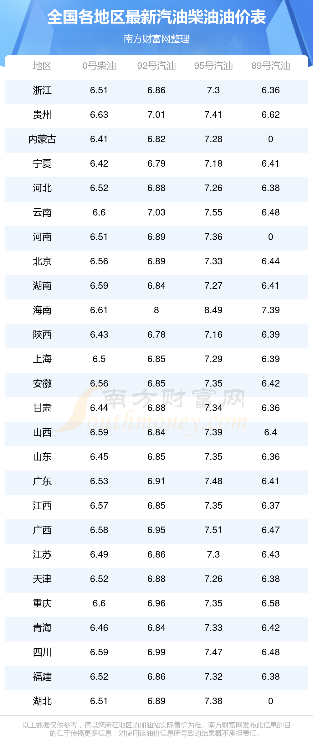 油價數據僅供參考,請以您所在地區(qū)的加油站報價為準。南方財富網發(fā)布此信息的目的在于傳播更多信息,對使用該油價信息所導致的結果概不承擔任何責任。