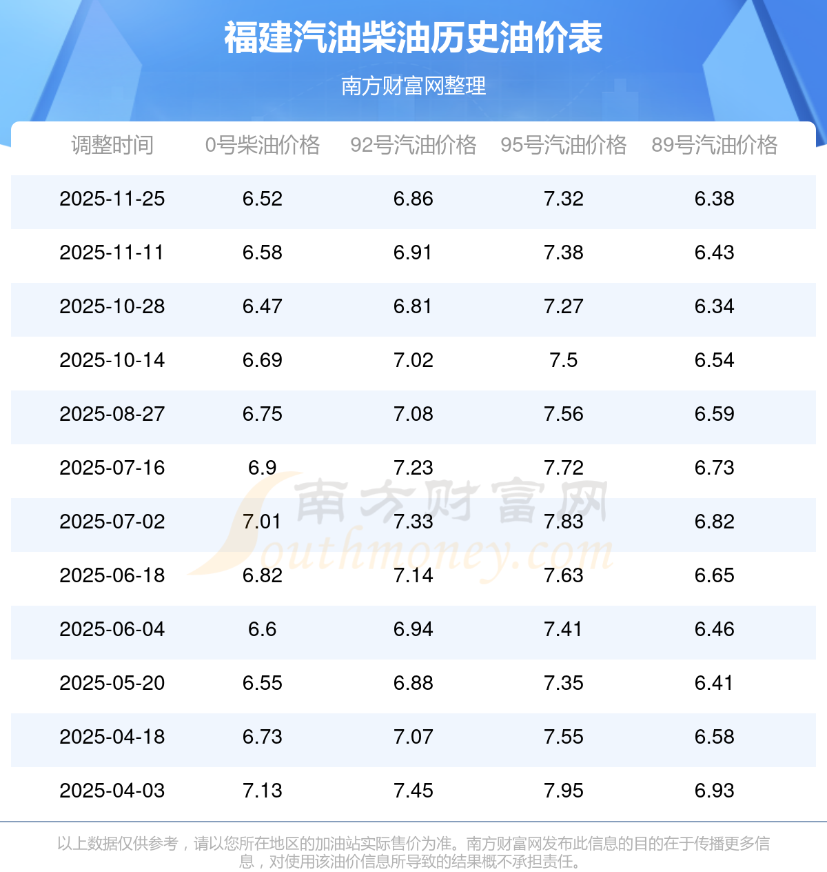 以上數據僅供參考,請以您所在地區(qū)的加油站實際售價為準。南方財富網發(fā)布此信息的目的在于傳播更多信息,對使用該油價信息所導致的結果概不承擔責任。