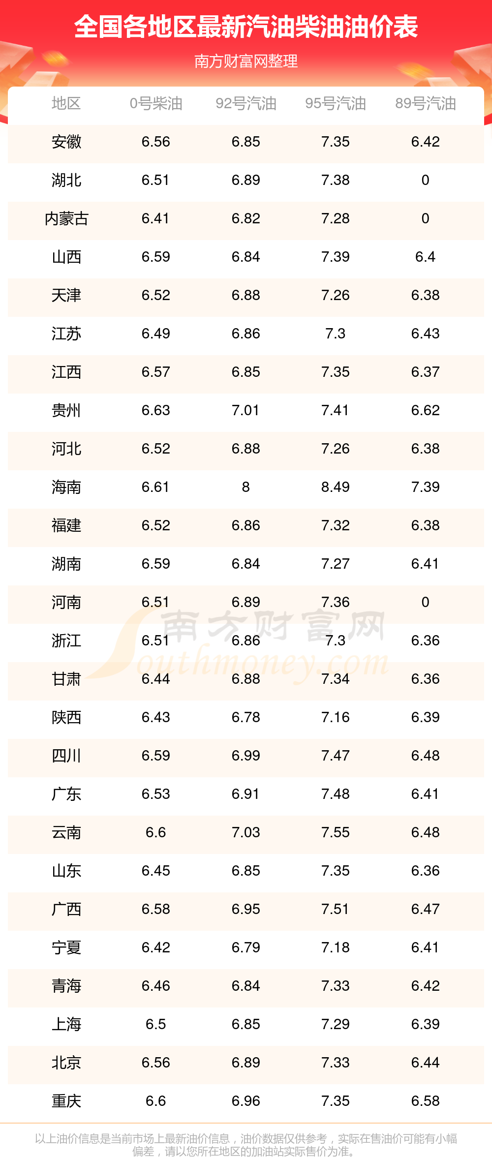 以上數(shù)據(jù)僅供參考,請(qǐng)以您所在地區(qū)的加油站實(shí)際售價(jià)為準(zhǔn)。南方財(cái)富網(wǎng)發(fā)布此信息的目的在于傳播更多信息,對(duì)使用該油價(jià)信息所導(dǎo)致的結(jié)果概不承擔(dān)責(zé)任。