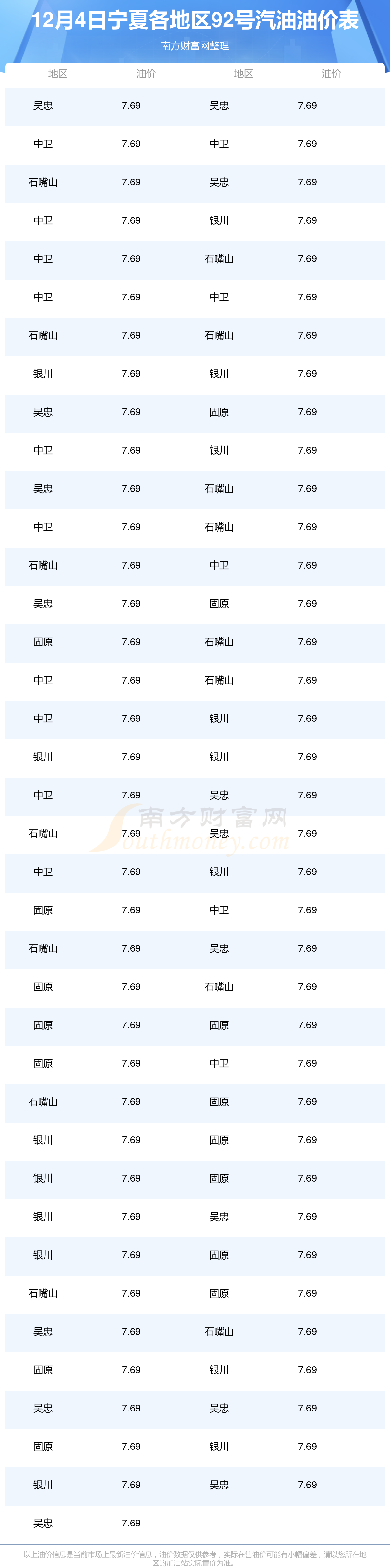 2025年12月4日寧夏92號(hào)汽油最新價(jià)格一覽表