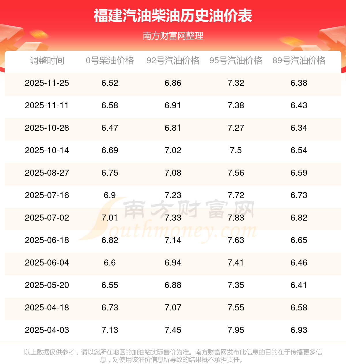 12月4日,福建95號(hào)汽油的價(jià)格是7.32元每升,本次的調(diào)整時(shí)間為11月25日,對(duì)比上次的調(diào)整下跌了0.06元,下跌0.813%,下次調(diào)整時(shí)間為12月8日24時(shí),還有4.38天。
