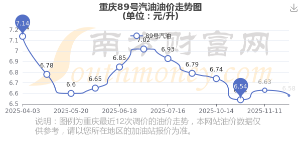 12月4日,重慶89號(hào)汽油的價(jià)格是6.58元每升,本次的調(diào)整時(shí)間為11月25日,對(duì)比上次的調(diào)整跌了0.05元,跌0.754%,下次調(diào)整時(shí)間為12月8日24時(shí),還有4.36天。