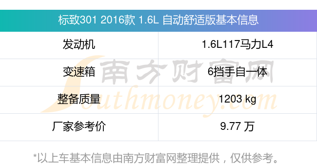 標(biāo)致301 2016款 1.6L 自動(dòng)舒適版搭載了一臺(tái)1.6L117馬力L4自然吸氣發(fā)動(dòng)機(jī),采用6擋手自一體自動(dòng)檔變速箱,常規(guī)整備質(zhì)量1203kg,廠家參考價(jià)9.77萬(wàn)元。