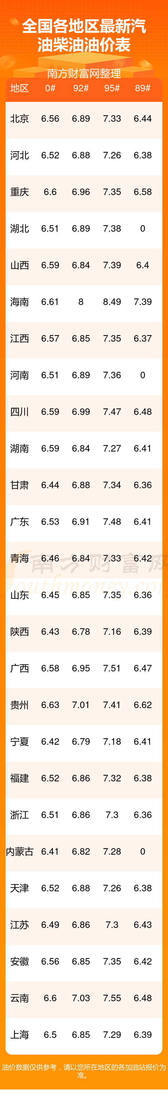 以上數(shù)據(jù)僅供參考,請以您所在地區(qū)的加油站實(shí)際售價為準(zhǔn)。南方財富網(wǎng)發(fā)布此信息的目的在于傳播更多信息,對使用該油價信息所導(dǎo)致的結(jié)果概不承擔(dān)責(zé)任。