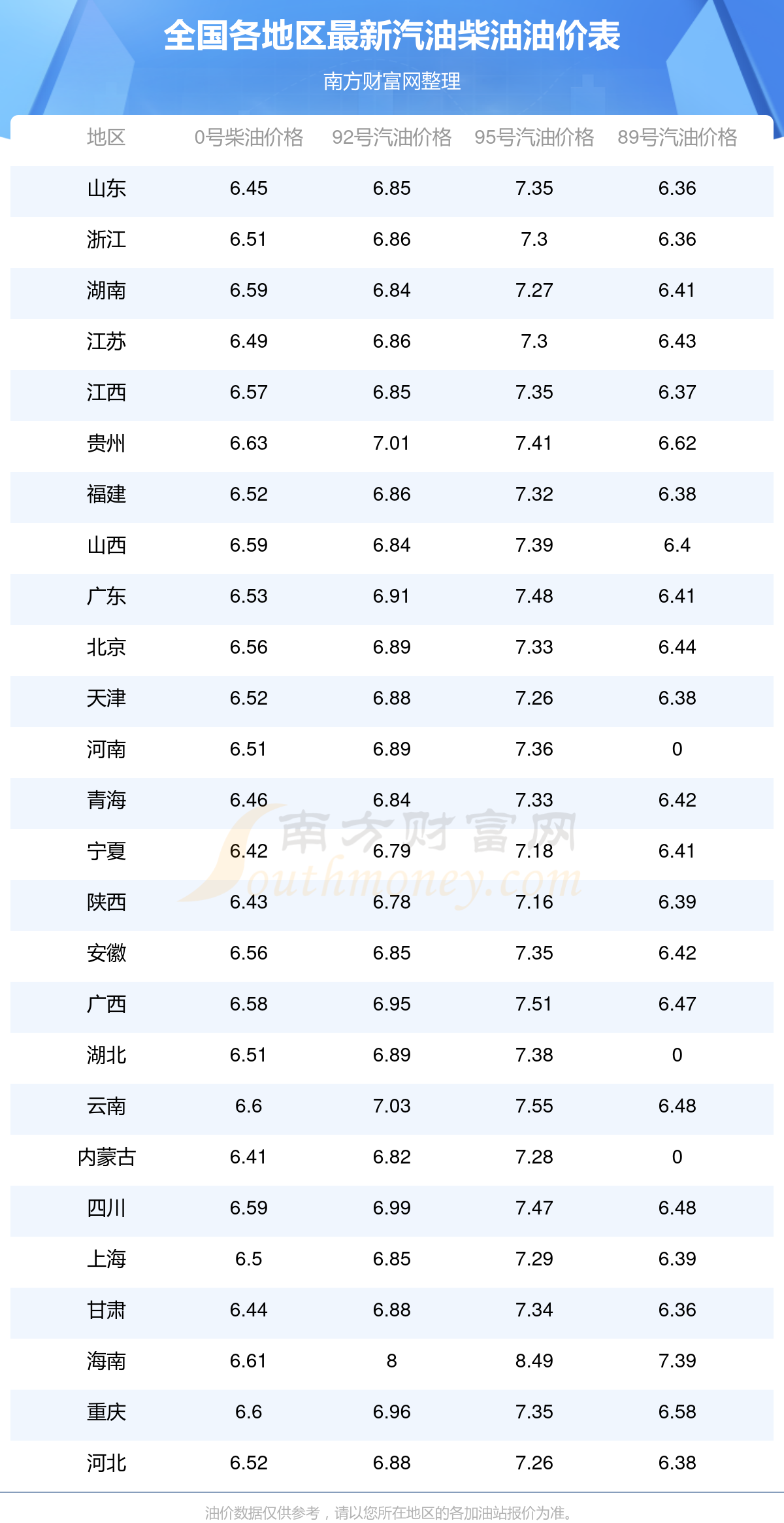 全國89號(hào)汽油平均價(jià)格為:6元每升,其中,最低為浙江,價(jià)格6.36元/升,最高為海南,價(jià)格7.39元/升。