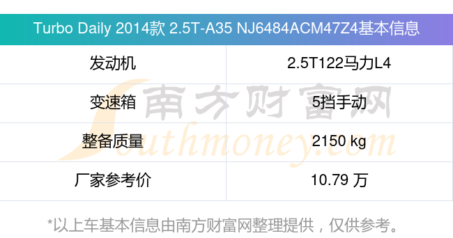 在動力上,Turbo Daily 2014款 2.5T-A35 NJ6484ACM47Z4配備的是一臺2.5T122馬力L4渦輪增壓發(fā)動機,匹配的是5擋手動擋變速箱,燃料形式為柴油,常規(guī)整備質(zhì)量2150kg,廠家參考價10.79萬元。