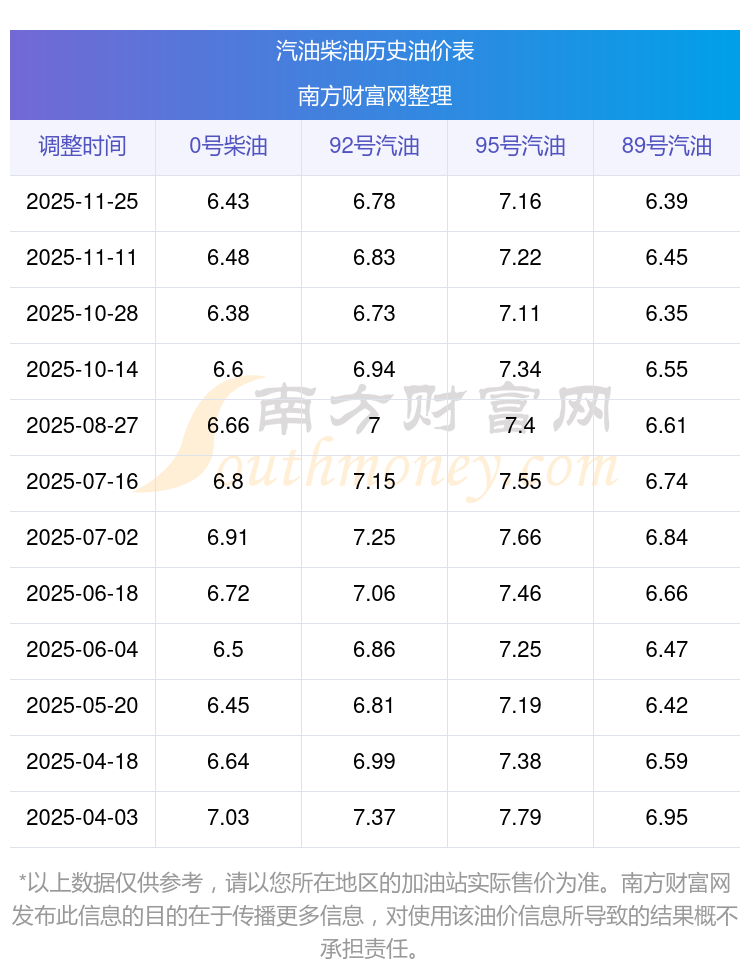 2025年95號(hào)汽油價(jià)格一覽表
