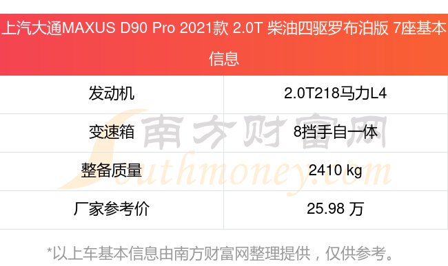 在動(dòng)力方面,上汽大通MAXUS D90 Pro 2021款 2.0T 柴油四驅(qū)羅布泊版 7座搭載的是一臺(tái)2.0T218馬力L4雙渦輪增壓發(fā)動(dòng)機(jī),匹配8擋手自一體自動(dòng)檔變速箱,燃料形式為柴油,常規(guī)整備質(zhì)量2410kg,廠家參考價(jià)25.98萬元。