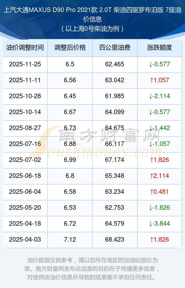 根據(jù)11月25日0號(hào)柴油最新調(diào)整價(jià)格6.5元/升來計(jì)算(以上海為例),該車型每百公里的平均油費(fèi)是62.465元,上一輪11月11日調(diào)整價(jià)格6.56元每升來計(jì)算,每百公里的平均油費(fèi)是63.042元,對(duì)比上一輪少花0.577元,下一輪的油價(jià)調(diào)整時(shí)間是12月8日24時(shí)。