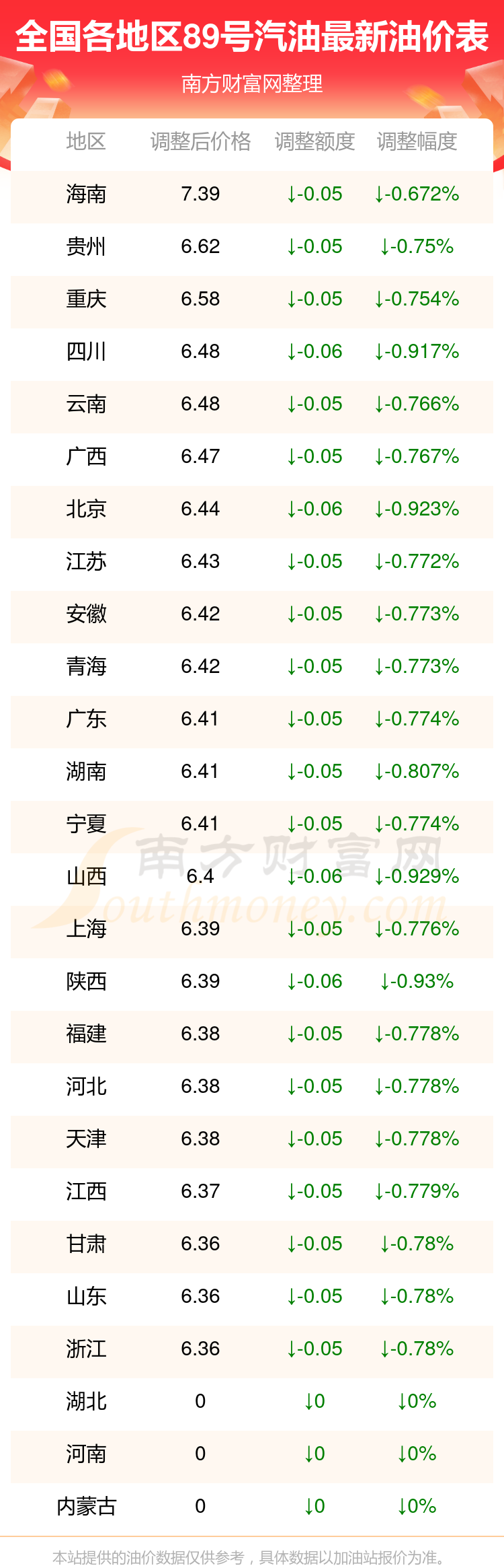 以上數(shù)據(jù)僅供參考,請以您所在地區(qū)的加油站實際售價為準。南方財富網(wǎng)發(fā)布此信息的目的在于傳播更多信息,對使用該油價信息所導致的結果概不承擔責任。