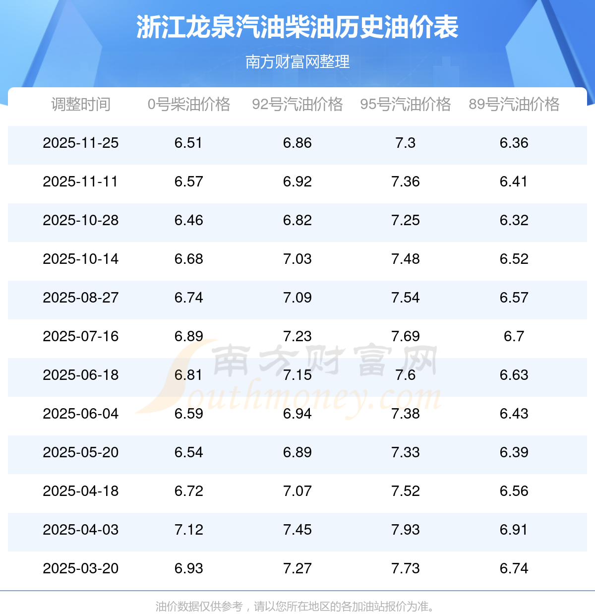 12月4日,浙江龍泉汽油、柴油每升最新價格為(11月25日調(diào)整后的價格):92號汽油為6.86元,跌了0.06元,跌幅達(dá)0.87%;95號汽油為7.3元,跌了0.06元,跌幅達(dá)0.82%;89號汽油為6.36元,跌了0.05元,跌幅達(dá)0.78%;0號柴油為6.51元,跌了0.06元,跌幅達(dá)0.91%。