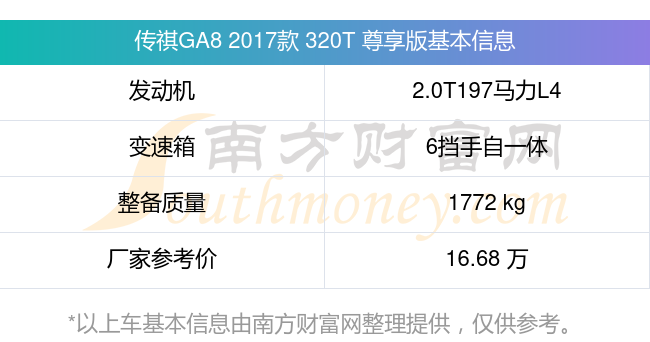 傳祺GA8 2017款 320T 尊享版動(dòng)力方面,搭載的是一臺(tái)2.0T197馬力L4渦輪增壓發(fā)動(dòng)機(jī),匹配6擋手自一體自動(dòng)檔變速箱,燃料形式為汽油,常規(guī)整備質(zhì)量1772kg,廠家參考價(jià)16.68萬(wàn)元。