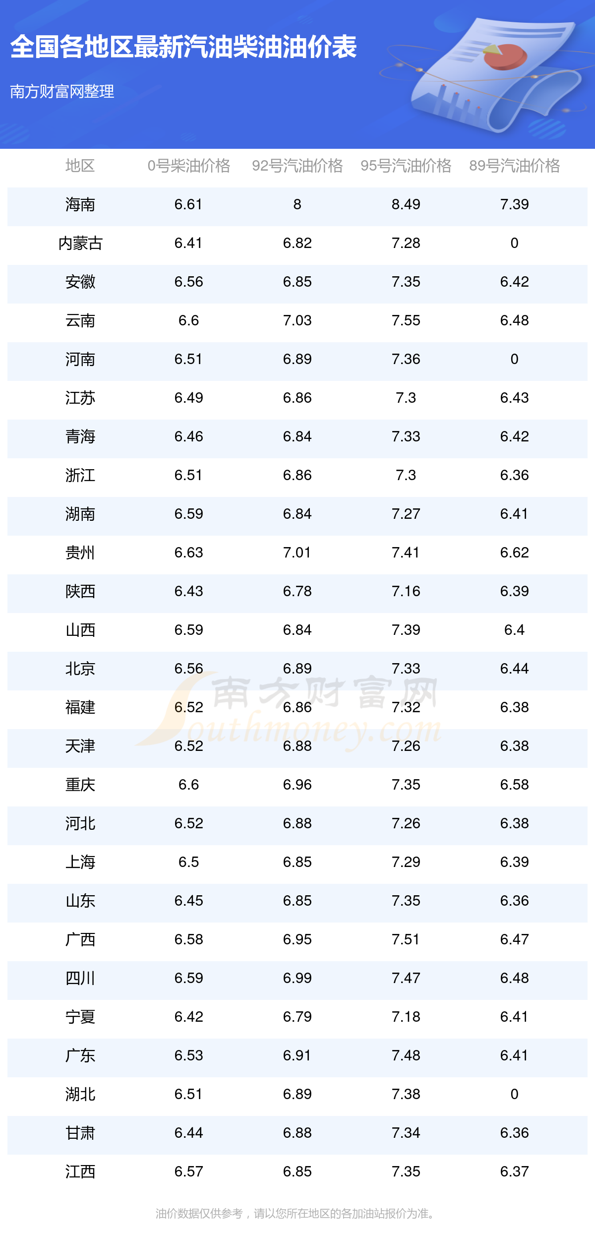 以上油價(jià)信息是當(dāng)前市場上最新油價(jià)信息,油價(jià)數(shù)據(jù)僅供參考,實(shí)際在售油價(jià)可能有小幅偏差,請以您所在地區(qū)的加油站實(shí)際售價(jià)為準(zhǔn)。