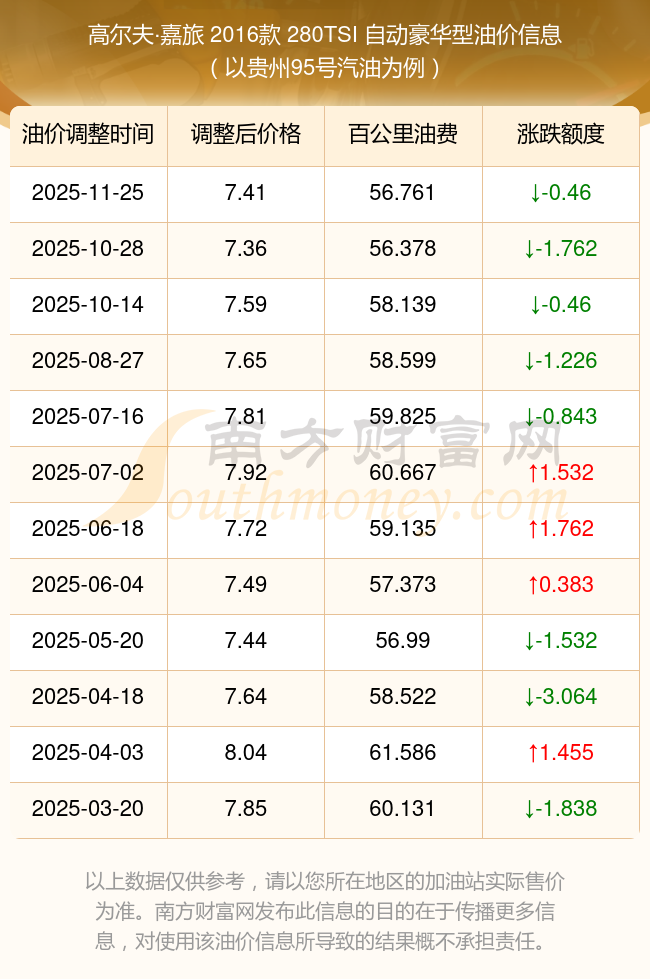 按照11月25日95號(hào)汽油最新調(diào)整價(jià)格7.41元/升來(lái)計(jì)算(以貴州為例),該車型百公里平均油費(fèi)為56.761元,按照上一輪10月28日調(diào)整價(jià)格7.47元/升來(lái)計(jì)算,百公里平均油費(fèi)為57.22元,對(duì)比上一輪少花0.46元,下一輪油價(jià)調(diào)整時(shí)間為12月8日24時(shí)。