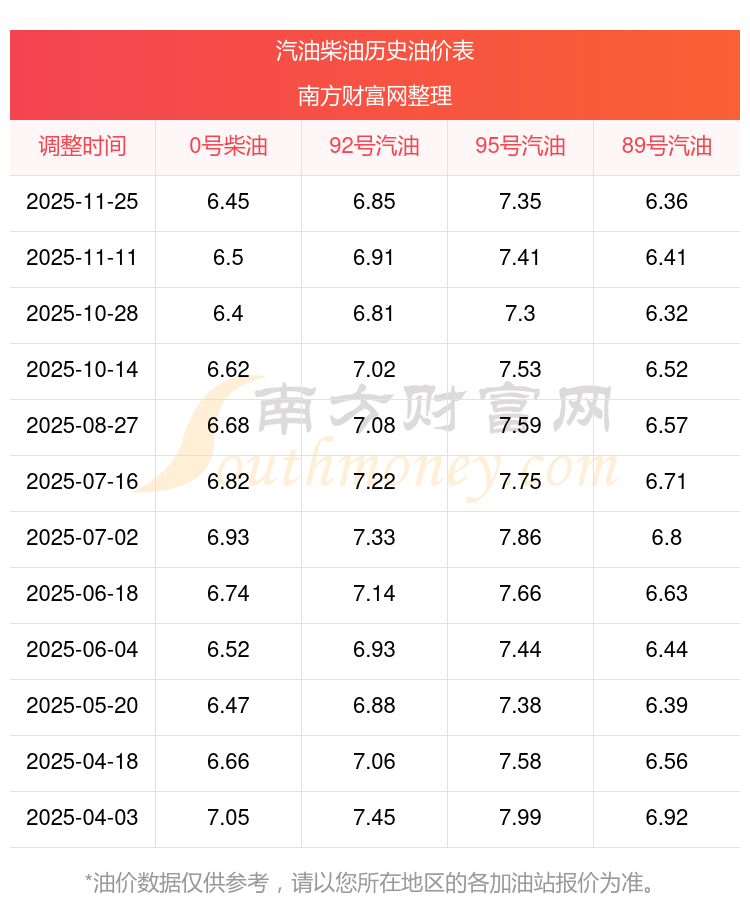 12月4日,山東煙臺92號汽油最新價格為:6.85元每升,調(diào)整時間為11月25日,相對上次調(diào)整時間11月11日的油價6.91元每升,跌了0.06元,跌幅達0.868%。下一輪油價調(diào)整時間12月8日24時,距離現(xiàn)在還有4.29天。