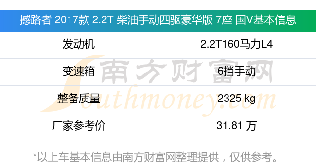 在動(dòng)力方面,撼路者 2017款 2.2T 柴油手動(dòng)四驅(qū)豪華版 7座 國(guó)V搭載的是一臺(tái)2.2T160馬力L4渦輪增壓發(fā)動(dòng)機(jī),匹配6擋手動(dòng)擋變速箱,燃料形式為柴油,常規(guī)整備質(zhì)量2325kg,廠家參考價(jià)31.81萬(wàn)元。