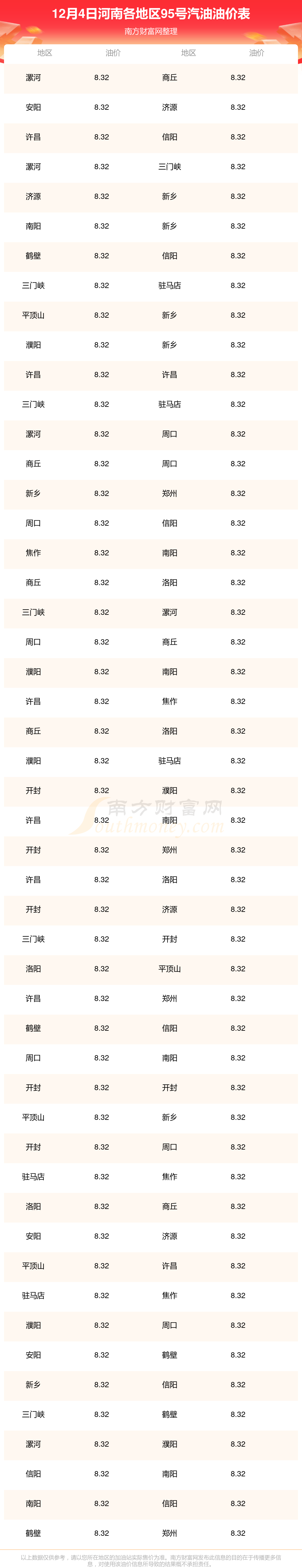 2025年12月4日河南95號(hào)汽油最新價(jià)格一覽表