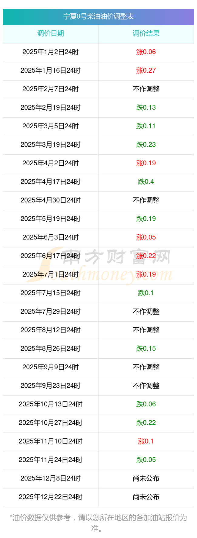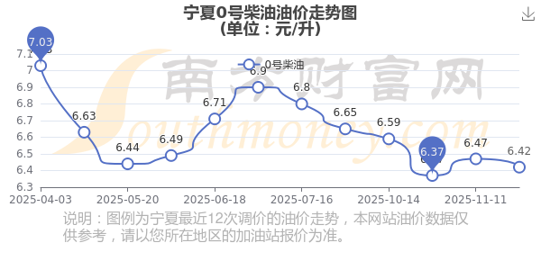 12月4日,寧夏0號柴油的價格是6.42元每升,本次的調整時間為11月25日,對比上次的調整降了0.05元,降0.773%,下次調整時間為12月8日24時,還有4.26天。
