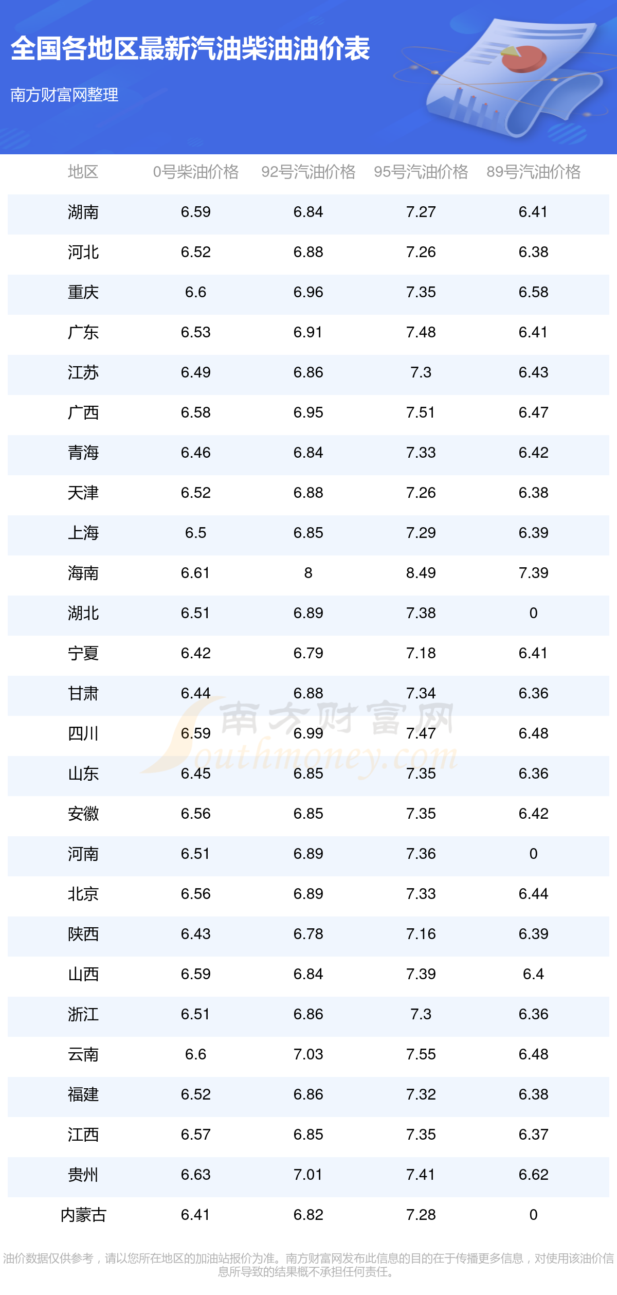 油價(jià)數(shù)據(jù)僅供參考,請(qǐng)以您所在地區(qū)的加油站報(bào)價(jià)為準(zhǔn)。南方財(cái)富網(wǎng)發(fā)布此信息的目的在于傳播更多信息,對(duì)使用該油價(jià)信息所導(dǎo)致的結(jié)果概不承擔(dān)任何責(zé)任。