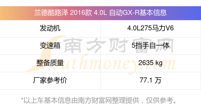 在動(dòng)力方面,蘭德酷路澤 2016款 4.0L 自動(dòng)GX-R搭載的是一臺(tái)4.0L275馬力V6自然吸氣發(fā)動(dòng)機(jī),匹配5擋手自一體自動(dòng)檔變速箱,燃料形式為汽油,常規(guī)整備質(zhì)量2635kg,廠家參考價(jià)77.1萬(wàn)元。
