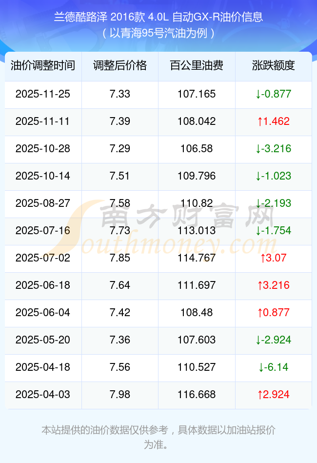 按照11月25日95號(hào)汽油最新調(diào)整價(jià)格7.33元/升來計(jì)算(以青海為例),該車型百公里平均油費(fèi)為107.165元,按照上一輪11月11日調(diào)整價(jià)格7.39元/升來計(jì)算,百公里平均油費(fèi)為108.042元,對(duì)比上一輪少花0.877元,下一輪油價(jià)調(diào)整時(shí)間為12月8日24時(shí)。