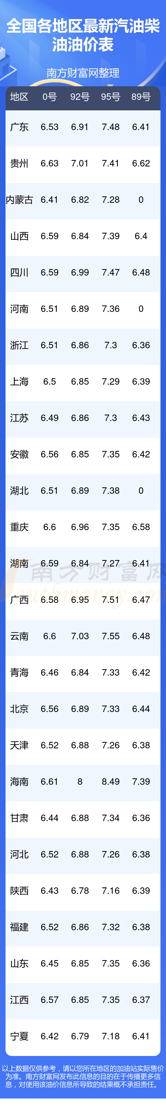 油價數(shù)據(jù)僅供參考,請以您所在地區(qū)的各加油站報價為準(zhǔn)。