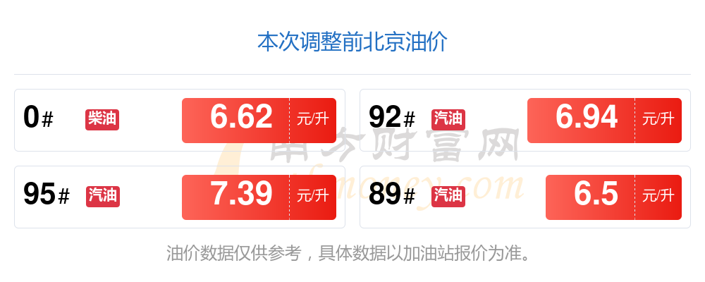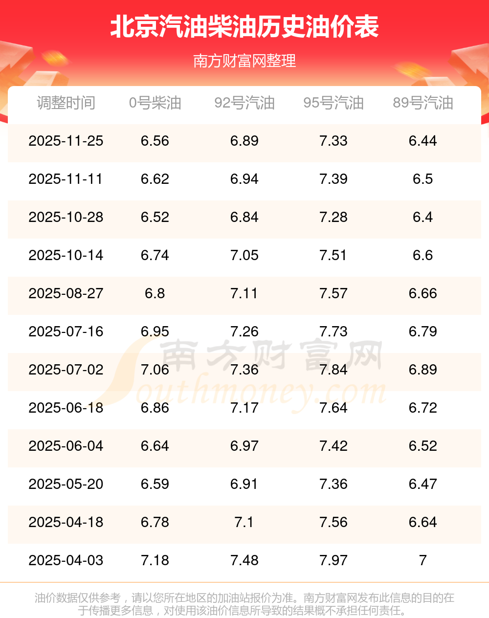 北京89號汽油12月4日的油價為11月25日調(diào)整后的價格,具體是6.44元/升,對比上次油價調(diào)整下調(diào)了0.06元,下調(diào)0.923%。