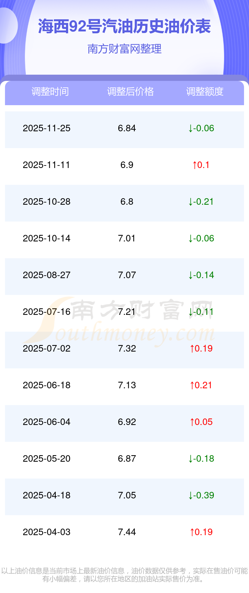 2025年92號汽油價格調(diào)整一覽表