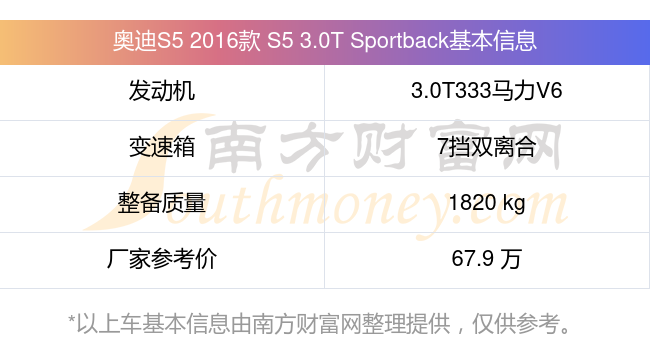 奧迪S5 2016款 S5 3.0T Sportback動力上配備的是一臺3.0T333馬力V6機械增壓發(fā)動機,匹配的是7擋雙離合自動檔變速箱,燃料形式為汽油,常規(guī)整備質量1820kg,廠家參考價67.9萬元。