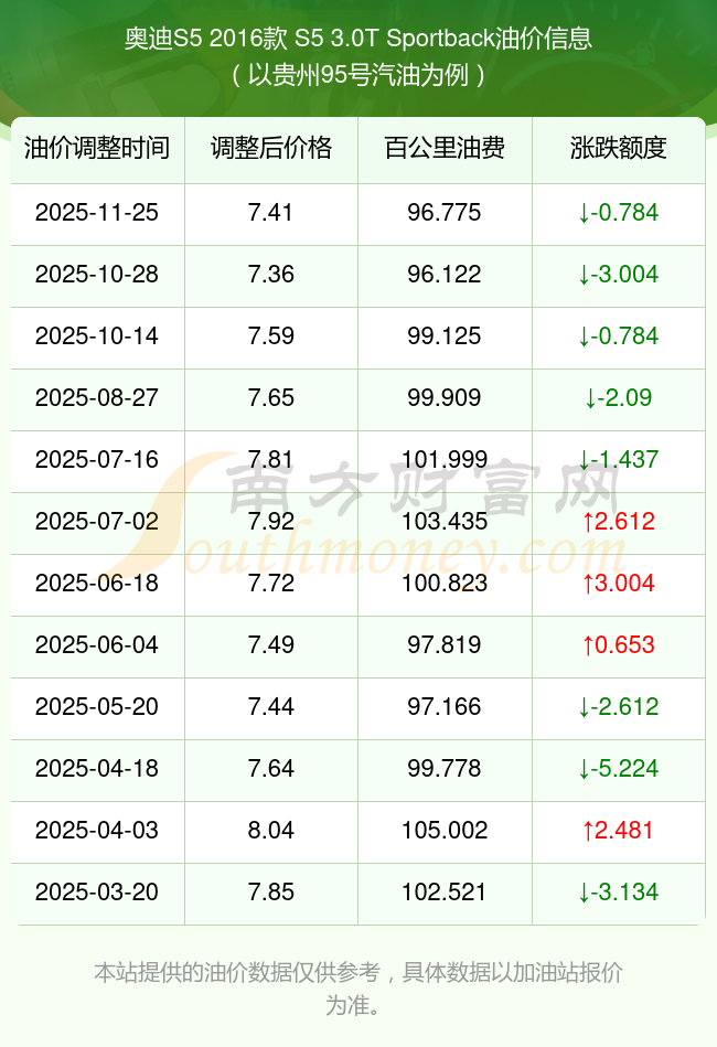 根據11月25日95號汽油最新調整價格7.41元/升來計算(以貴州為例),該車型每百公里的平均油費是96.775元,上一輪10月28日調整價格7.47元每升來計算,每百公里的平均油費是97.558元,對比上一輪少花0.784元,下一輪的油價調整時間是12月8日24時。