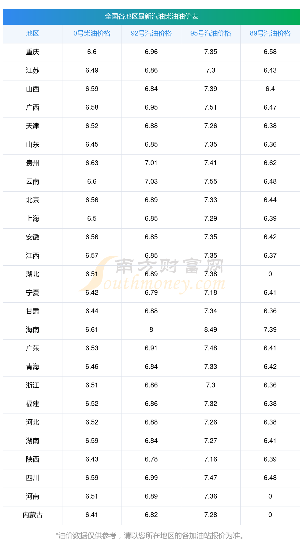 本次油價的調整時間為11月25日,調整后全國92號汽油平均價格為7元每升,其中,最低的是陜西,6.78元每升,最高的是海南,8.00元每升。全國95號汽油平均價格為7元每升,其中,最低的是陜西,7.16元每升,最高的是海南,8.49元每升。全國0號柴油平均價格為:7元每升,其中,最低的是內蒙古,6.41元每升,最高的是貴州,6.63元每升。全國89號汽油平均價格為6元每升,其中,最低的是浙江,6.36元每升,最高的是海南,7.39元每升。,下一輪油價調整時間12月8日24時,距離現(xiàn)在還有4.22天。