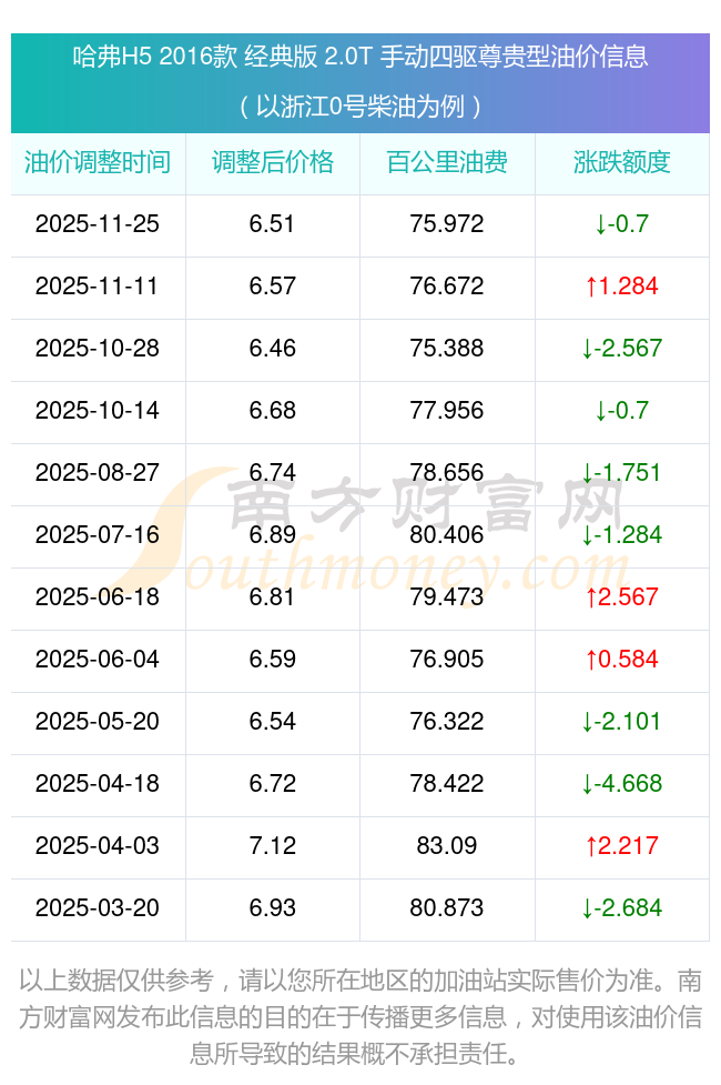 按11月25日0號(hào)柴油最新調(diào)整價(jià)格6.51元每升來計(jì)算(以浙江為例),該車型百公里平均油費(fèi)為75.972元,按上一輪11月11日調(diào)整價(jià)格6.57元每升來計(jì)算,百公里平均油費(fèi)為76.672元,對(duì)比上一輪少花0.7元,下一輪油價(jià)調(diào)整時(shí)間為12月8日24時(shí)。