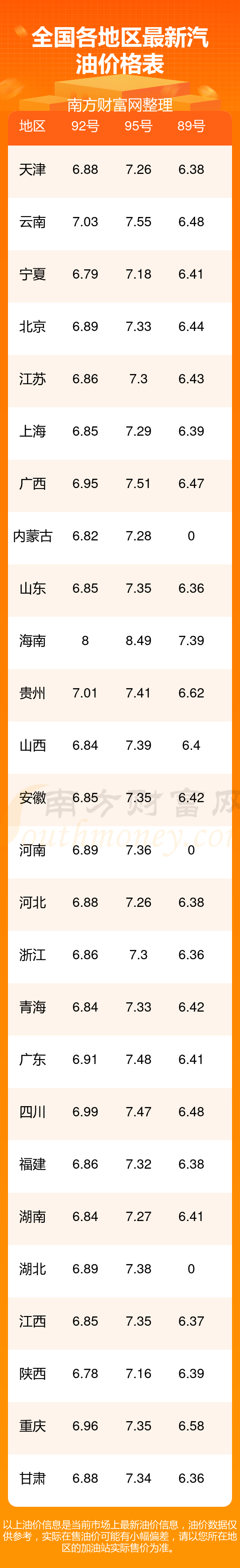 本次油價的調(diào)整時間為11月25日,調(diào)整后全國92號汽油平均價格為7元每升,其中,最低的是陜西,6.78元每升,最高的是海南,8.00元每升。全國95號汽油平均價格為7元每升,其中,最低的是陜西,7.16元每升,最高的是海南,8.49元每升。全國0號柴油平均價格為:7元每升,其中,最低的是內(nèi)蒙古,6.41元每升,最高的是貴州,6.63元每升。全國89號汽油平均價格為6元每升,其中,最低的是浙江,6.36元每升,最高的是海南,7.39元每升。