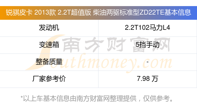 銳騏皮卡 2013款 2.2T超值版 柴油兩驅(qū)標(biāo)準(zhǔn)型ZD22TE動力方面,搭載的是一臺2.2T102馬力L4渦輪增壓發(fā)動機,匹配5擋手動擋變速箱,燃料形式為柴油,廠家參考價7.98萬元。