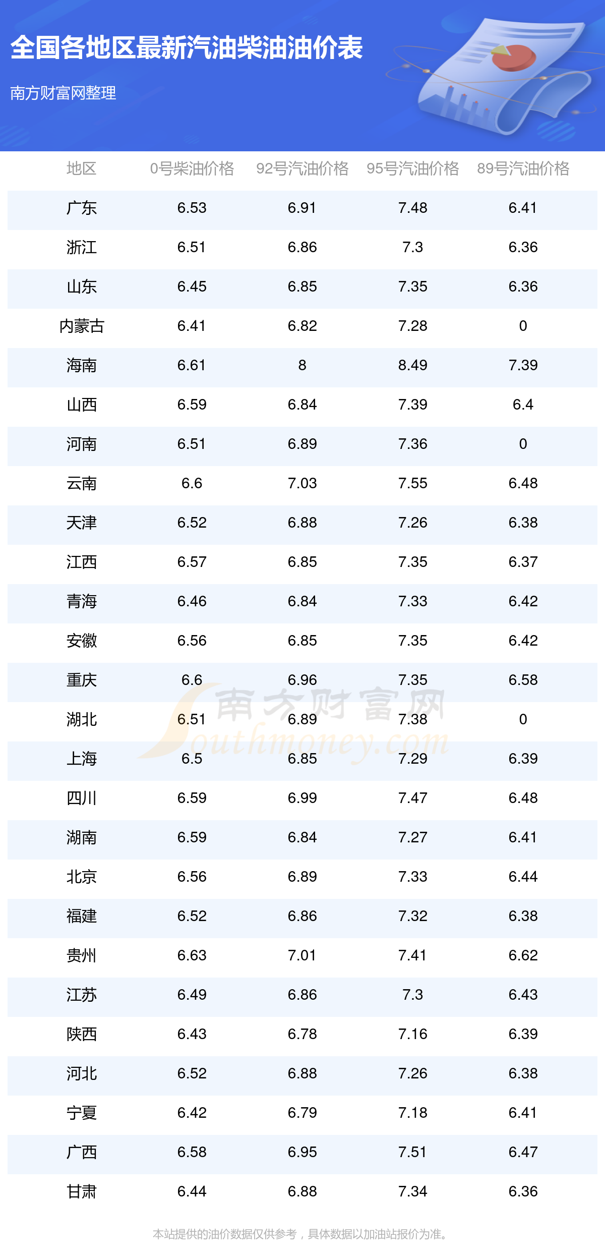 以上數(shù)據(jù)僅供參考,請(qǐng)以您所在地區(qū)的加油站實(shí)際售價(jià)為準(zhǔn)。南方財(cái)富網(wǎng)發(fā)布此信息的目的在于傳播更多信息,對(duì)使用該油價(jià)信息所導(dǎo)致的結(jié)果概不承擔(dān)責(zé)任。