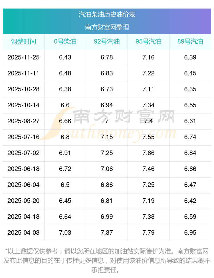 2025年92號汽油價格一覽表