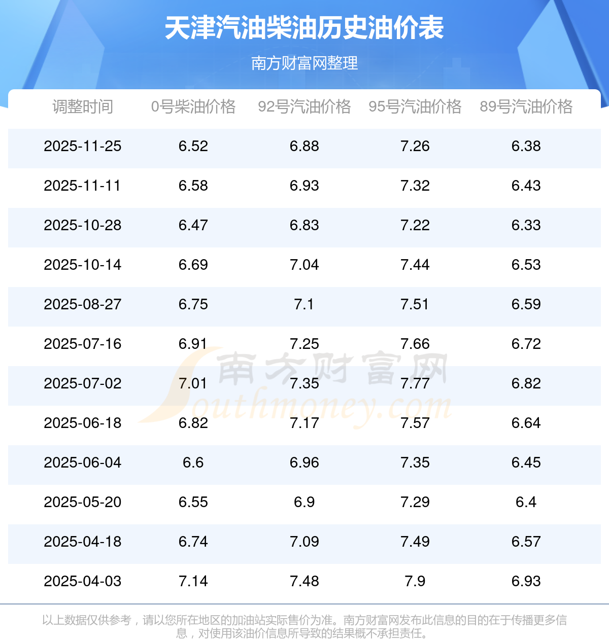 油價調(diào)整最新消息:12月4日天津汽油、柴油價格是11月25日調(diào)整后的價格,每升價格具體為:92號汽油為6.88元,減了0.05元,減幅達(dá)0.72%;95號汽油為7.26元,減了0.06元,減幅達(dá)0.82%;89號汽油為6.38元,減了0.05元,減幅達(dá)0.78%;0號柴油為6.52元,減了0.06元,減幅達(dá)0.91%。天津下一輪油價調(diào)整時間12月8日24時,距離現(xiàn)在還有4.15天。