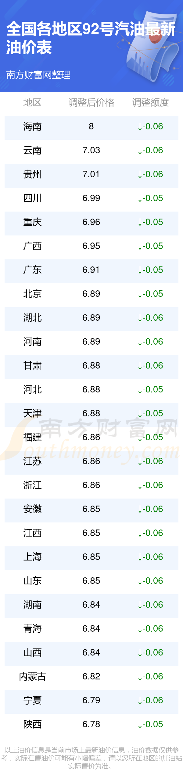 92號(hào)汽油平均價(jià)格:7元每升,其中,最高為海南,價(jià)格8.00元/升,最低為陜西,價(jià)格6.78元/升。