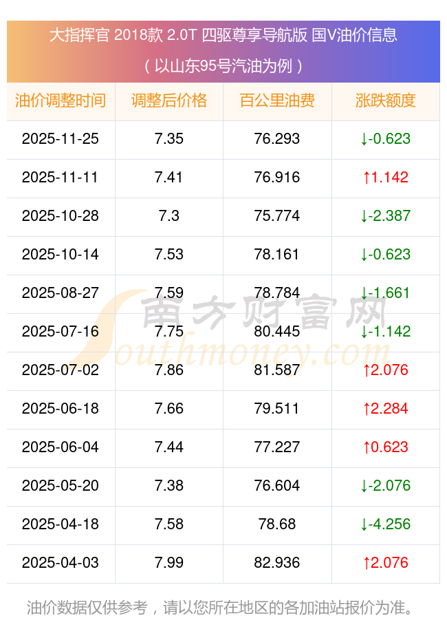 依照11月25日95號(hào)汽油最新調(diào)整價(jià)格7.35元/升來(lái)計(jì)算(以山東為例),該車型百公里的平均油費(fèi)是76.293元,依照上一輪11月11日調(diào)整價(jià)格7.41元/升來(lái)計(jì)算,百公里的平均油費(fèi)是76.916元,對(duì)比上一輪少花0.623元,下一輪的油價(jià)調(diào)整時(shí)間12月8日24時(shí)。