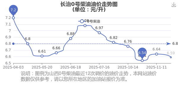 長治0號柴油12月4日最新價格為6.59元/升,為11月25日油價調(diào)整后的價格,相對上次調(diào)整時間11月11日的油價6.64元每升,下降了0.05元,下降0.753%。