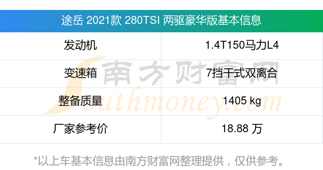 在動(dòng)力方面,途岳 2021款 280TSI 兩驅(qū)豪華版搭載的是一臺(tái)1.4T150馬力L4渦輪增壓發(fā)動(dòng)機(jī),匹配7擋干式雙離合自動(dòng)檔變速箱,燃料形式為汽油,常規(guī)整備質(zhì)量1405kg,廠家參考價(jià)18.88萬元。