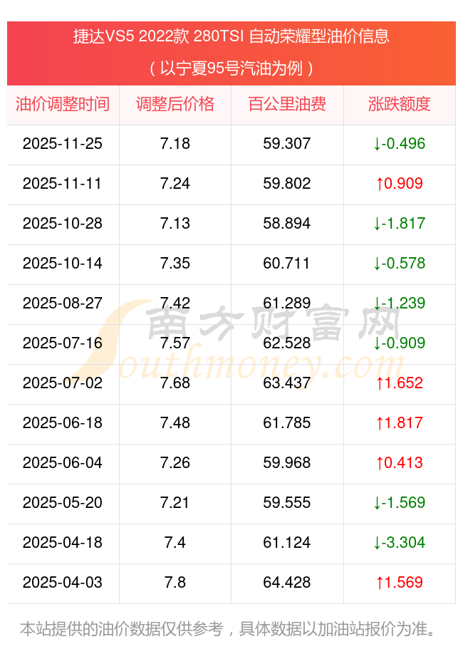 按照11月25日95號汽油最新調(diào)整價格7.18元/升來計算(以寧夏為例),該車型百公里平均油費為59.307元,按照上一輪11月11日調(diào)整價格7.24元/升來計算,百公里平均油費為59.802元,對比上一輪少花0.496元,下一輪油價調(diào)整時間為12月8日24時。